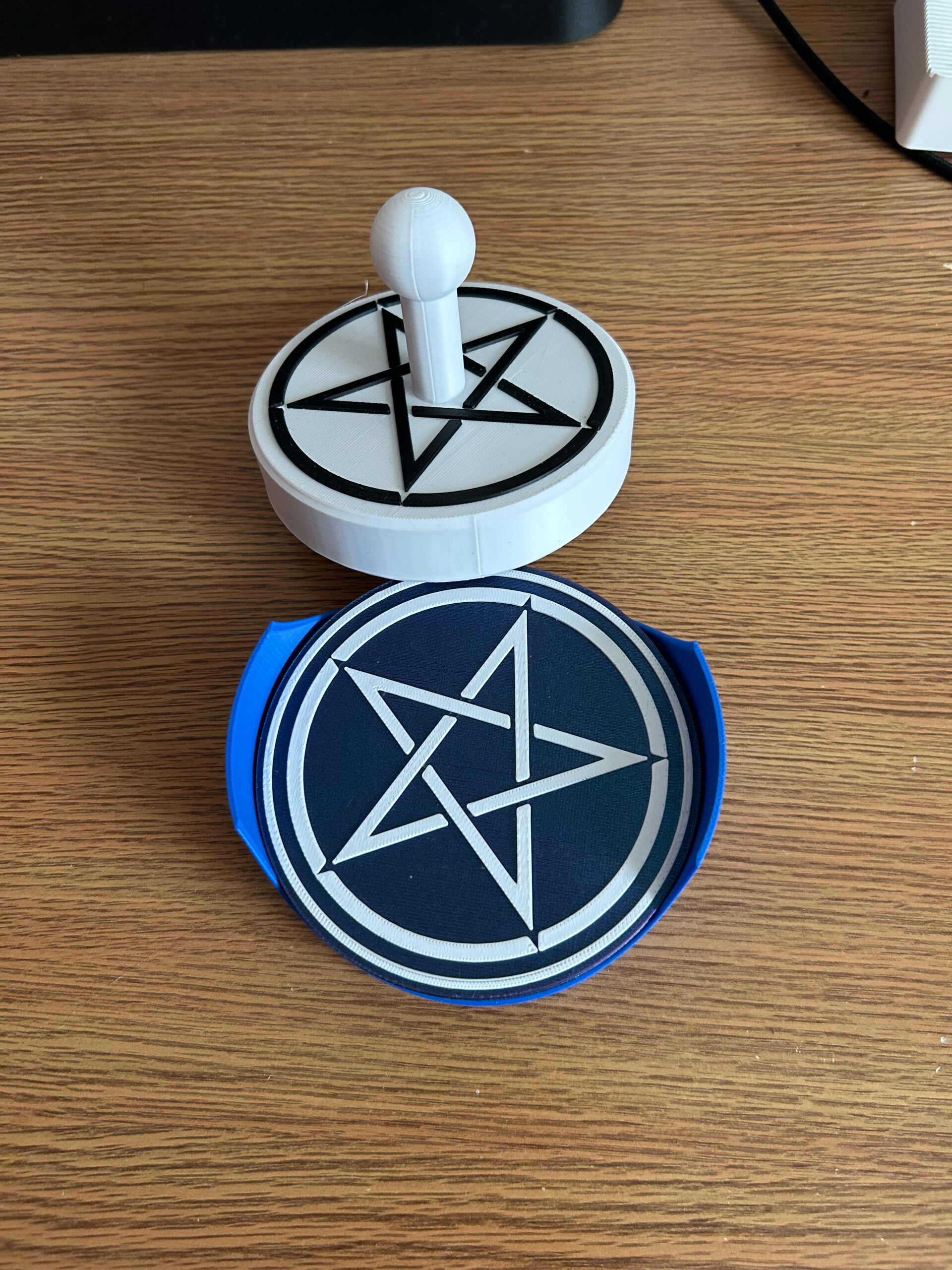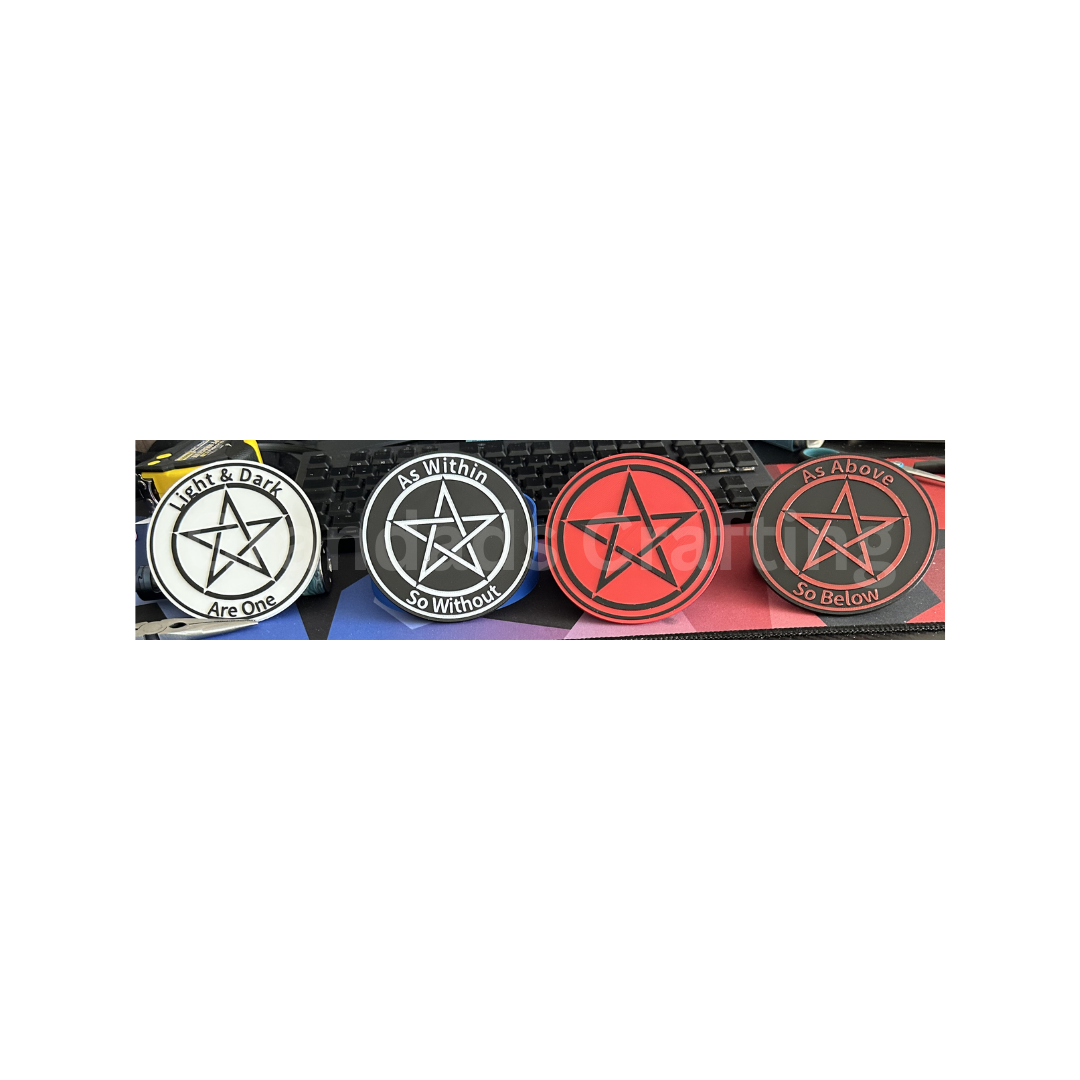 Bring balance and spiritual energy to your home with this unique four-piece 3D-printed Wiccan coaster set. The collection features three coasters inscribed with profound verses: 'As within, so without,' to reflect inner and outer worlds; 'As above, so below,' to connect the physical and spiritual; and 'Light and dark are one,' to honor duality. The fourth coaster is a protective pentagram, a classic symbol of the five elements in harmony. Each piece is crafted at a 105mm diameter and has a soft, non-slip cork backing for a perfect blend of form and function